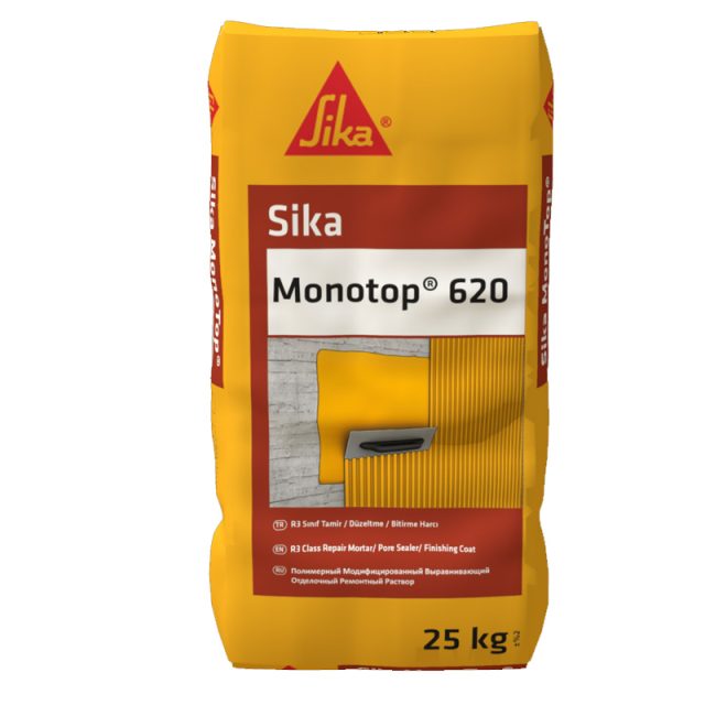 Sika MonoTop®-620, çimento esaslı, silis dumanı içeren, polimer modifiye, tek bileşenli, EN 1504-3’e göre R3 sınıfı, düzeltme ve bitirme harcıdır.