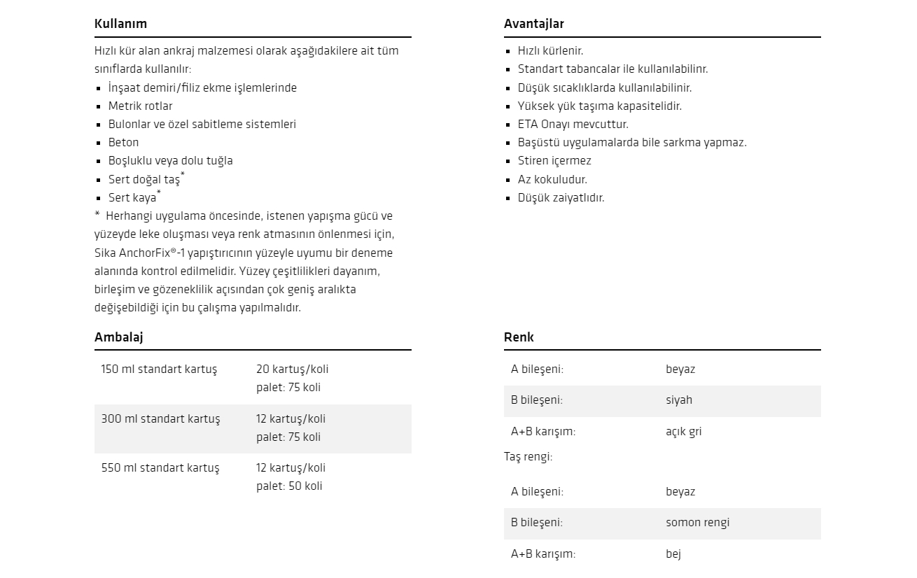 Solvent ve stiren içermeyen, poliester esaslı, iki bileşenli ankraj malzemesi.