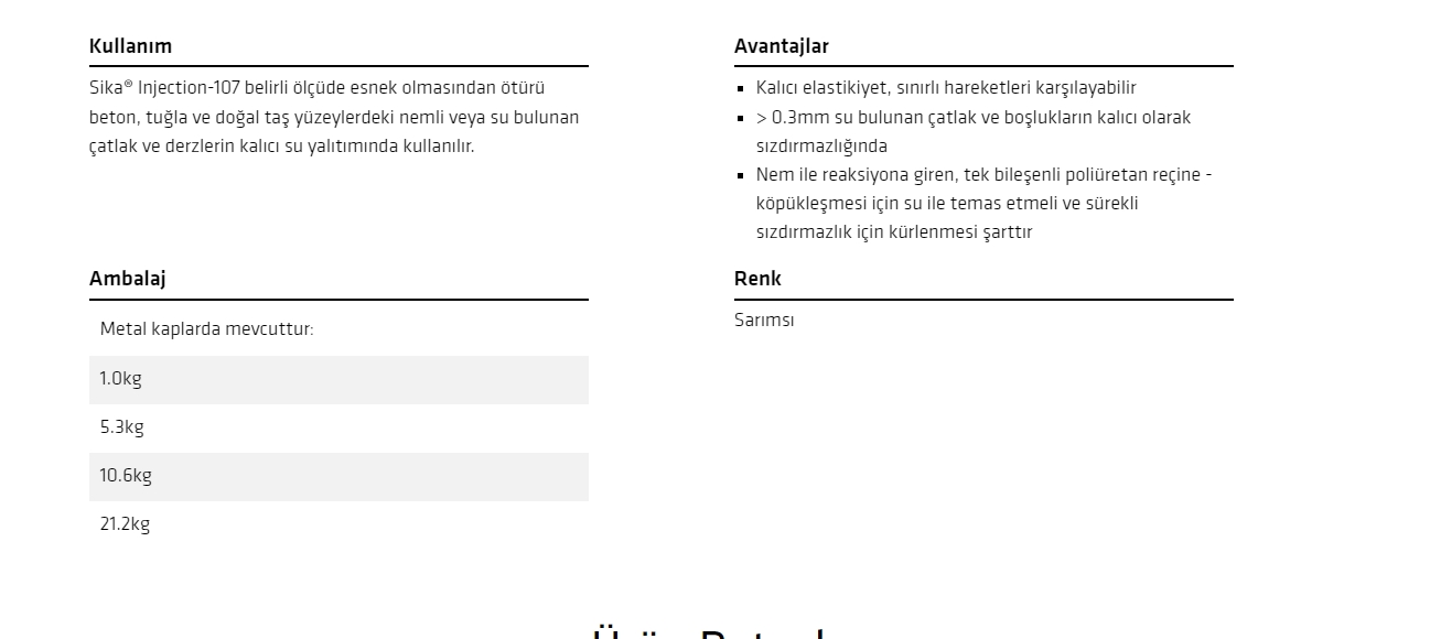 Sika® Injection-107 çatlakların, boşlukların ve yarıkların sızdırmazlığında kalıcı su yalıtımı için kullanıma hazır, tek bileşenli, poliüretan esaslı kısmen esnek, enjeksiyon köpük reçinesi.