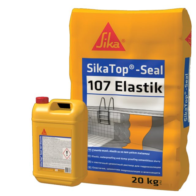 SikaTop® Seal-107 Elastik, sıvı polimer ve özel katkılar içeren çimento esaslı karışımdan oluşan iki bileşenli su geçirimsizlik sağlayan, elastik su yalıtım malzemesidir.