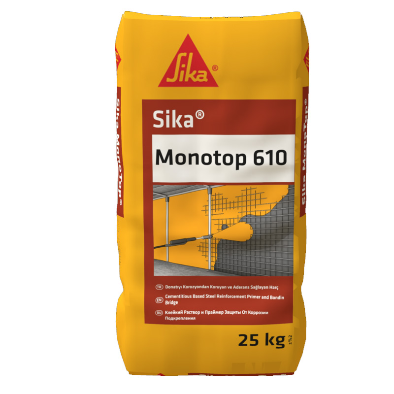 R4 SINIFI POLİMER MODİFİYE TAMİR HARCI Sika MonoTop®-612, çimento esaslı, silis dumanı ve lif içeren, polimer modifiye, klor geçirgenliği düşük, tek bileşenli, EN1504-3 'e göre R4 sınıfı tamir harcıdır. Tek bileşenlidir, yalnızca su ile karıştırılarak kullanılır. Kıvamı ayarlanabilir Tiksotropik özelliği ile özellikle düşey ve baş üstü uygulamaları için idealdir. Karıştırma Oranı 25 kg'lık bir torba malzeme...